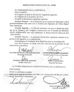 Por Resolución Legislativa Nº 23680 del 13 de octubre de 1983, se dispuso que se colocara en el hemiciclo una curul, con su nombre y que al pasar lista en el Congreso se mencionase a Grau y todos respondieran ¡ Presente ¡